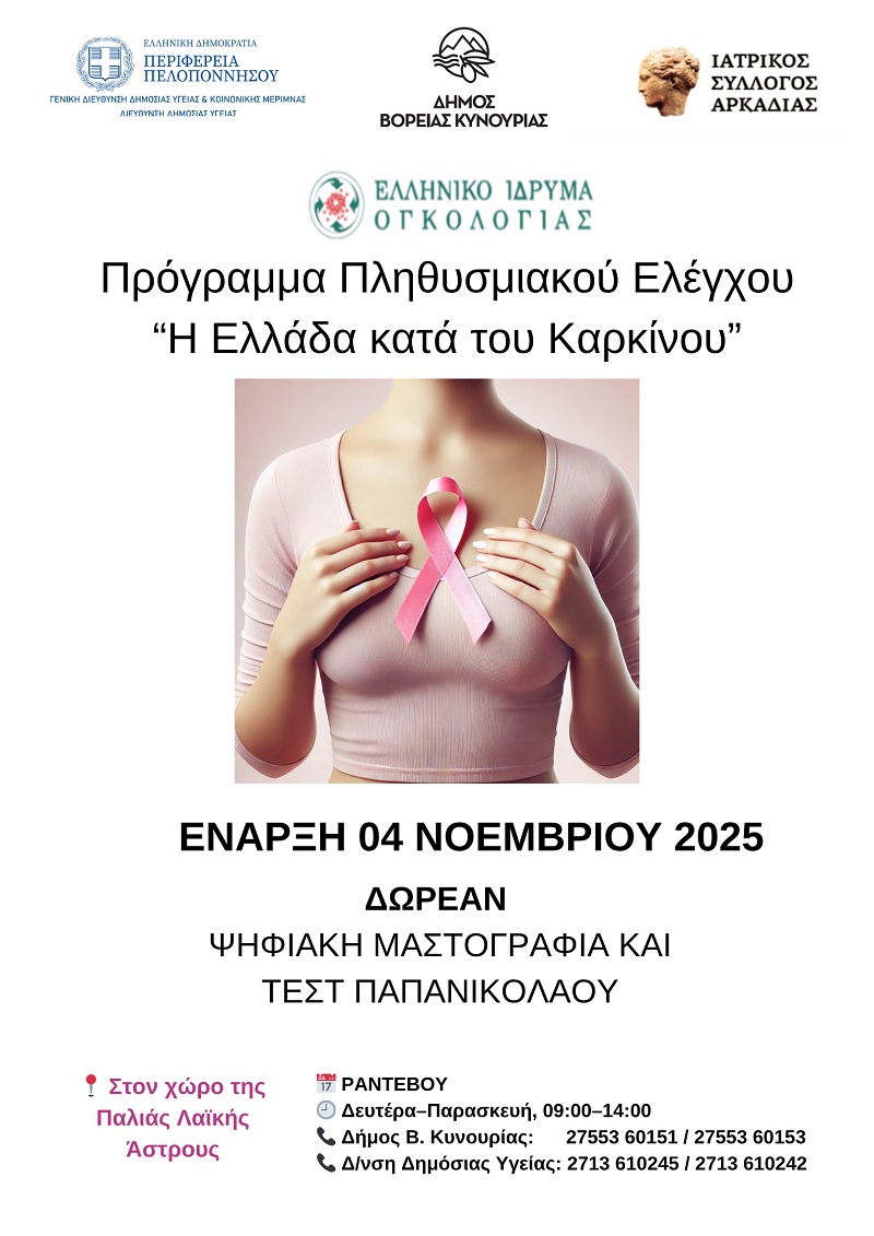 Ψηφιακή Μαστογραφία και Τεστ Παπανικολάου παρέχονται από το Ελληνικό Ίδρυμα Ογκολογίας, υπό την αιγίδα της Περιφέρειας Πελοποννήσου, στον γυναικείο πληθυσμό του Δήμου Βόρειας Κυνουρίας. Στο πλαίσιο του προγράμματος πληθυσμιακού ελέγχου «Η ΕΛΛΑΔΑ ΚΑΤΑ ΤΟΥ ΚΑΡΚΙΝΟΥ», που πραγματοποιεί το Ελληνικό Ίδρυμα Ογκολογίας σε συνεργασία με την Περιφέρεια Πελοποννήσου για την πρόληψη και την έγκαιρη διάγνωση του καρκίνου του μαστού και του τραχήλου της μήτρας, ξεκινά την Τρίτη 04/11/2025 πρόγραμμα πληθυσμιακού ελέγχου για τις γυναίκες που κατοικούν στον Δήμο Βόρειας Κυνουρίας με εξέταση Ψηφιακής Μαστογραφίας και Τεστ Παπανικολάου. Το πρόγραμμα υλοποιείται υπό την αιγίδα της Περιφέρειας Πελοποννήσου-Γενική Διεύθυνση Δημόσιας Υγείας & Κοινωνικής Μέριμνας, του Δήμου Βόρειας Κυνουρίας και του Ιατρικού Συλλόγου Αρκαδίας.Οι εξετάσεις παρέχονται, όπως πάντα, εντελώς δωρεάν χωρίς οικονομικά, ασφαλιστικά ή φορολογικά κριτήρια.Στόχος του προγράμματος αυτού είναι η εξέταση όλων των γυναικών ηλικίας από 25 έως 70 ετών με Τεστ Παπανικολάου, και των γυναικών ηλικίας από 40 ετών και άνω επιπροσθέτως με ψηφιακή Μαστογραφία. Επίσης, σκοπό έχει και τον επανέλεγχο όλων των γυναικών, που συμμετείχαν στο συγκεκριμένο πρόγραμμα κατά την προηγούμενη φάση εξετάσεων. Στις γυναίκες ηλικίας από 30 έως 50 ετών θα διενεργείται Τεστ Παπ με την νέα μέθοδο υγρής φάσης thin prep και θα γίνεται μοριακή ταυτοποίηση του ιού HPV.Οι εξετάσεις θα πραγματοποιούνται, από την Τρίτη 04 Νοεμβρίου 2025 στην ειδική αυτοκίνητη μονάδα που διαθέτει το Ελληνικό Ίδρυμα Ογκολογίας, η οποία θα βρίσκεται σταθμευμένη στον χώρο της παλιάς λαϊκής Άστρους. Οι ενδιαφερόμενες μπορούν να επικοινωνούν στο τηλέφωνο 27553 60151/153 στον Δήμο Βόρειας Κυνουρίας για να προγραμματίσουν το ραντεβού τους.Οι διαγνώσεις των μαστογραφιών και των λαμβανομένων επιχρισμάτων γίνονται από έμπειρους ιατρούς ακτινολόγους και κυτταρολόγους, βάσει των ευρωπαϊκών κατευθυντηρίων οδηγιών των προγραμμάτων πληθυσμιακού ελέγχου.Η ενημέρωση των αποτελεσμάτων των εξετάσεων γίνεται ταχυδρομικώς με προσωπική επιστολή. Στην περίπτωση που κριθεί απαραίτητος περαιτέρω έλεγχος, οι εξετασθείσες καλούνται και πάλι για συμπληρωματικές εξετάσεις οι οποίες πραγματοποιούνται, επίσης δωρεάν, είτε στην κινητή είτε στην σταθερή μονάδα του Ιδρύματος. Εάν χρειαστεί ιατρική παρέμβαση προτείνεται η παραπομπή των γυναικών στο νοσοκομείο «Ο Άγιος Σάββας», το οποίο είναι το νοσοκομείο αναφοράς.